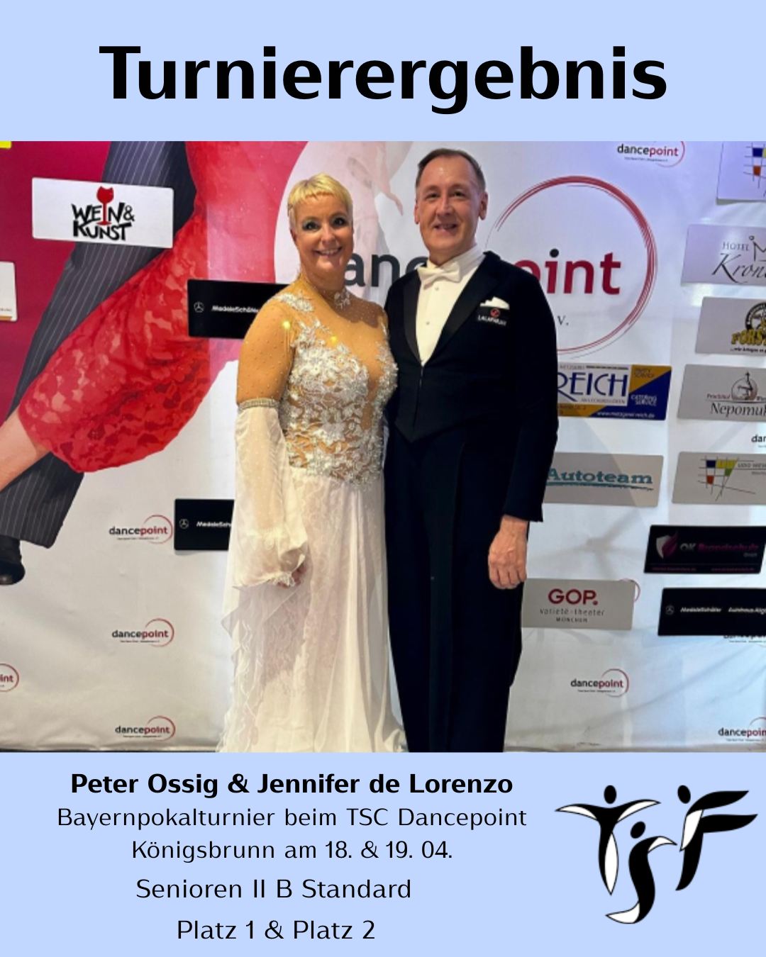 Peter und Jenni meldeten sich nach einjähriger Turnierpause beim Bayernpokal in Königsbrunn zurück, und konnten in allen Turnieren glänzen. In der Senioren II B Standard wurde es am Samstag ein sehr guter zweiter Platz, am Sonntag haben sie sich sogar den Turniersieg erkämpft! Auch in der Senioren II A Latein konnten sie am Samstag das Finale erreichen, und belegten dort den fünften Platz.