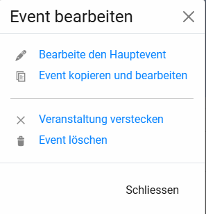Klickt man das an, bekommt man verschiedene Optionen zur Bearbeitung/Löschung des Termins angezeigt.