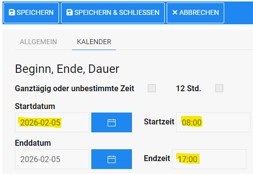 - Reiterkarte "Kalender": Start-/Enddatum, sowie Start-/Endzeit
