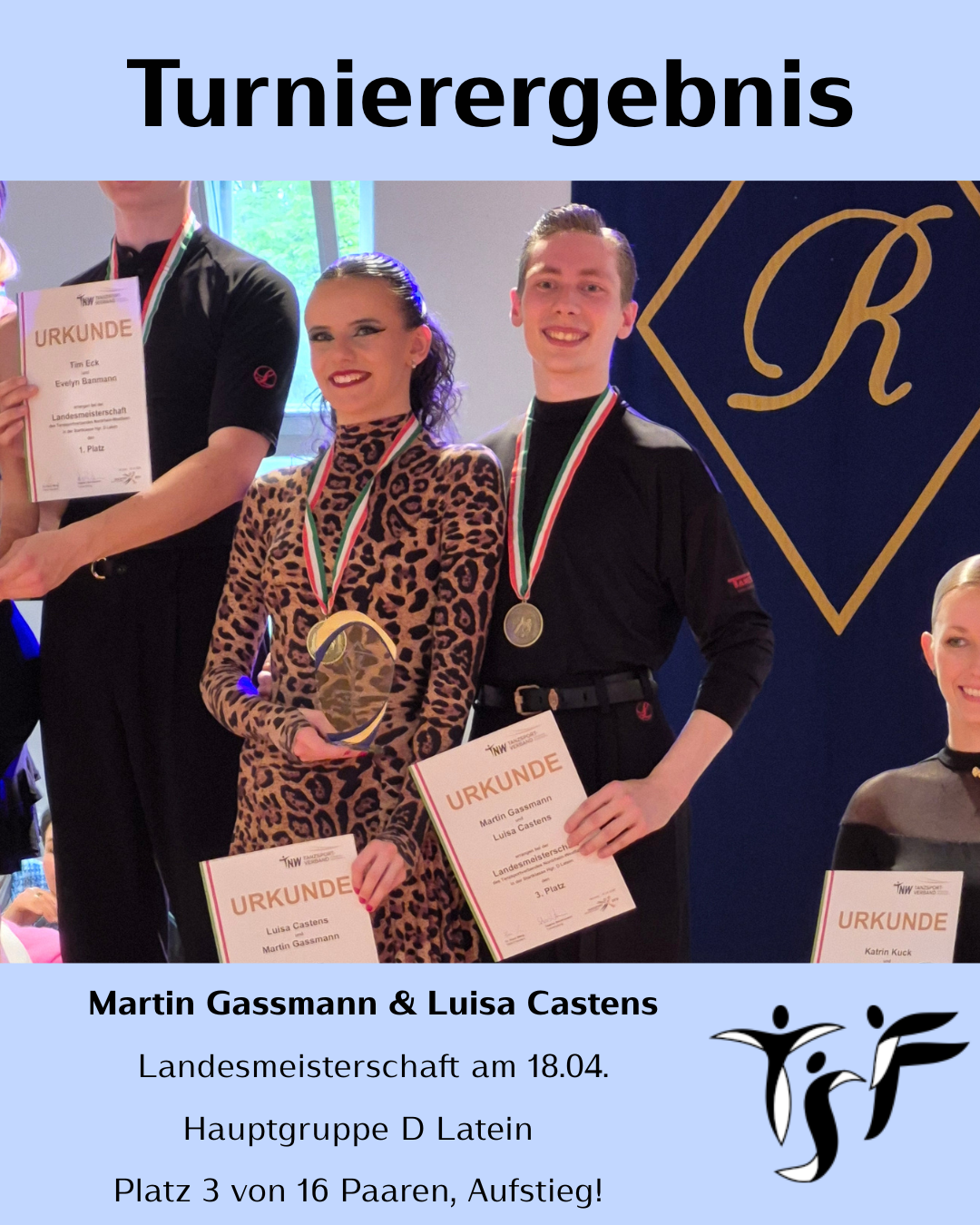 Am Samstag stand auch für Martin und Luisa ein wichtiges Turnier an: Die Landesmeisterschaft in der Hauptgruppe D Latein in Münster. Bei den Beiden hat es leider nicht für den Turniersieg gereicht, aber sie konnten sich aufs Treppchen tanzen, und sind mit einem guten dritten Platz per Beschluss in die Hauptgruppe C Latein aufgestiegen! Im anschließenden Turnier der neuen Klasse konnten sie bereits erste Punkte sammeln.